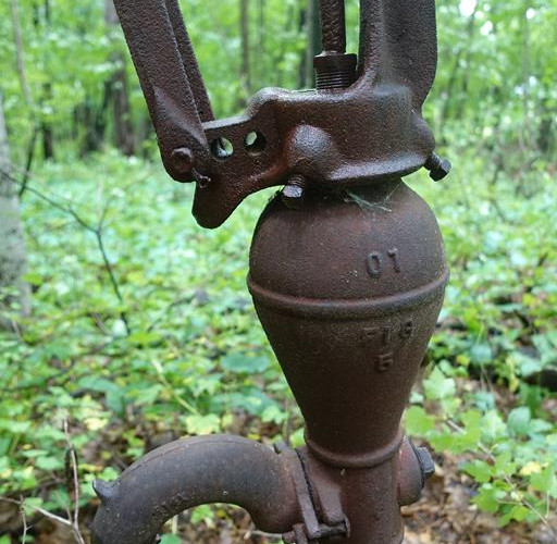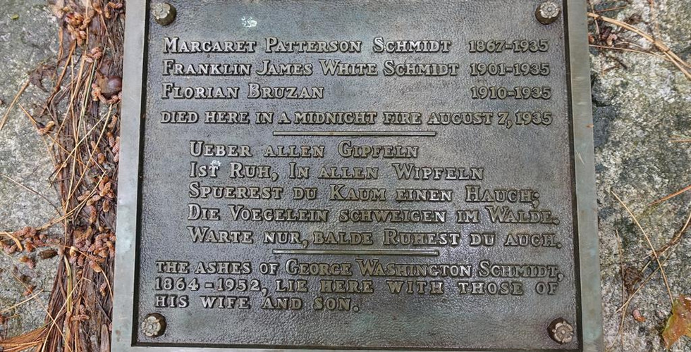 Recalling something online that advised entering near the northeast corner of the woods, we returned there and found the other sign. There's an inconspicuous pulloff (N 44°54.6895 W 90°54.1345) that leads to a faint path into the woods. This in turn leads to remains of the Schmidt farmhouse that burned down in 1935. As partly explained on the plaque placed on what we understand to be the original front step, Margaret Schmidt Bergsang converted her family's home to a nature preserve in memory of her mother and brother who died in the fire.